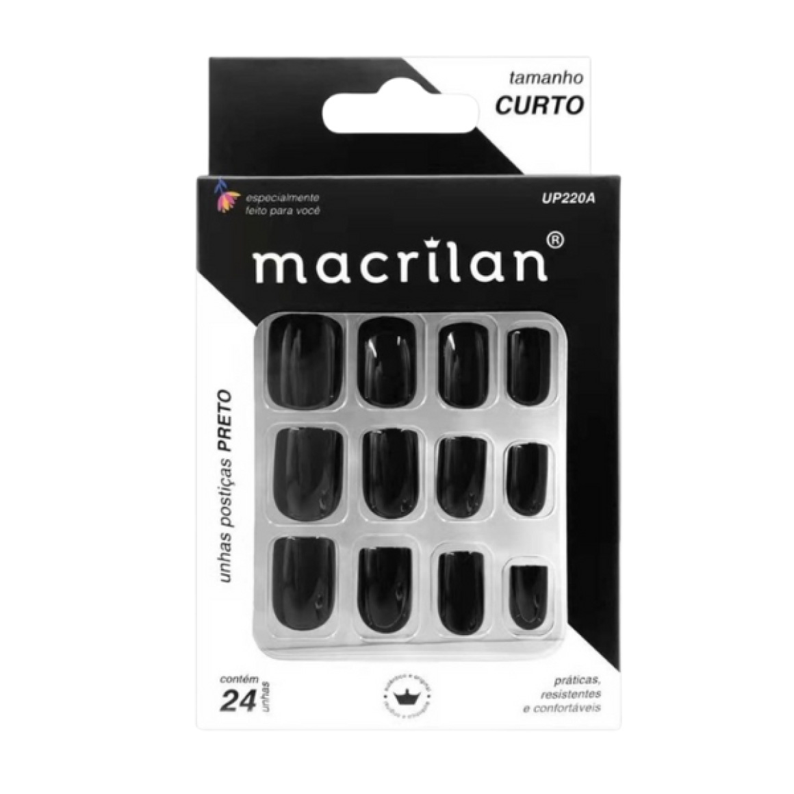 Unhas Postiças Macrilan UP220A curtas especialmente desenvolvidas em uma versão colorida para uma aplicação rápida e segura. Indicadas para uso pessoal e profissional.