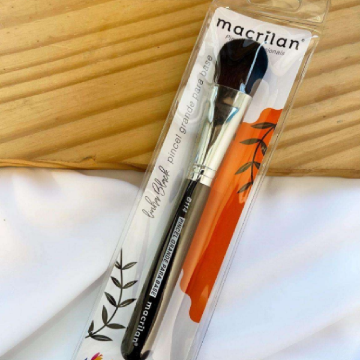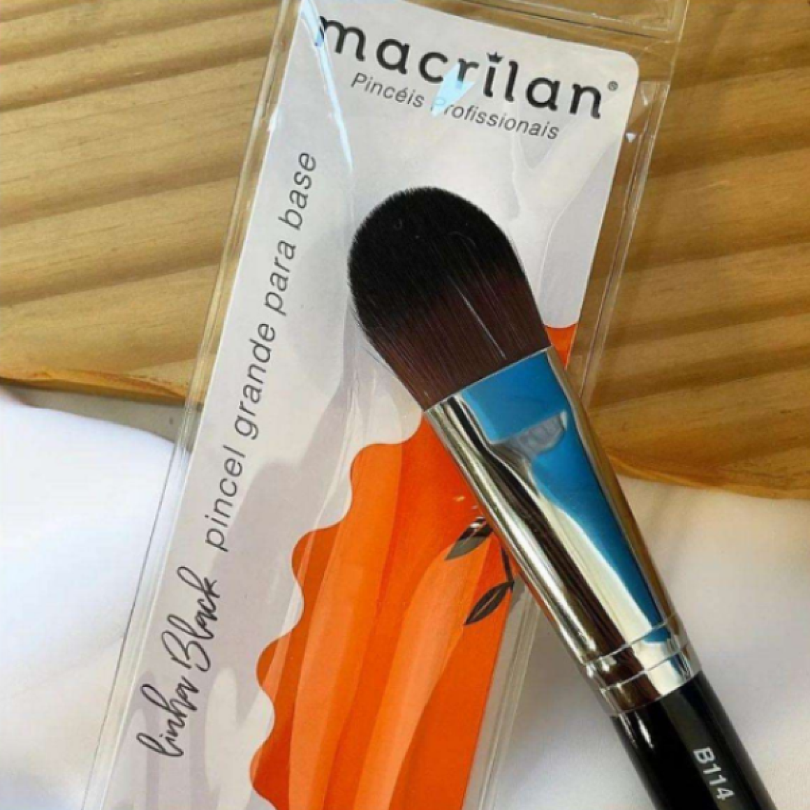 Pincel Macrilan B114, especialmente desenvolvido para aplicar e distribuir base em creme ou líquida em todas as áreas da face. Feito com cerdas especiais que permitem uma aplicação suave e uma maquiagem uniforme.
