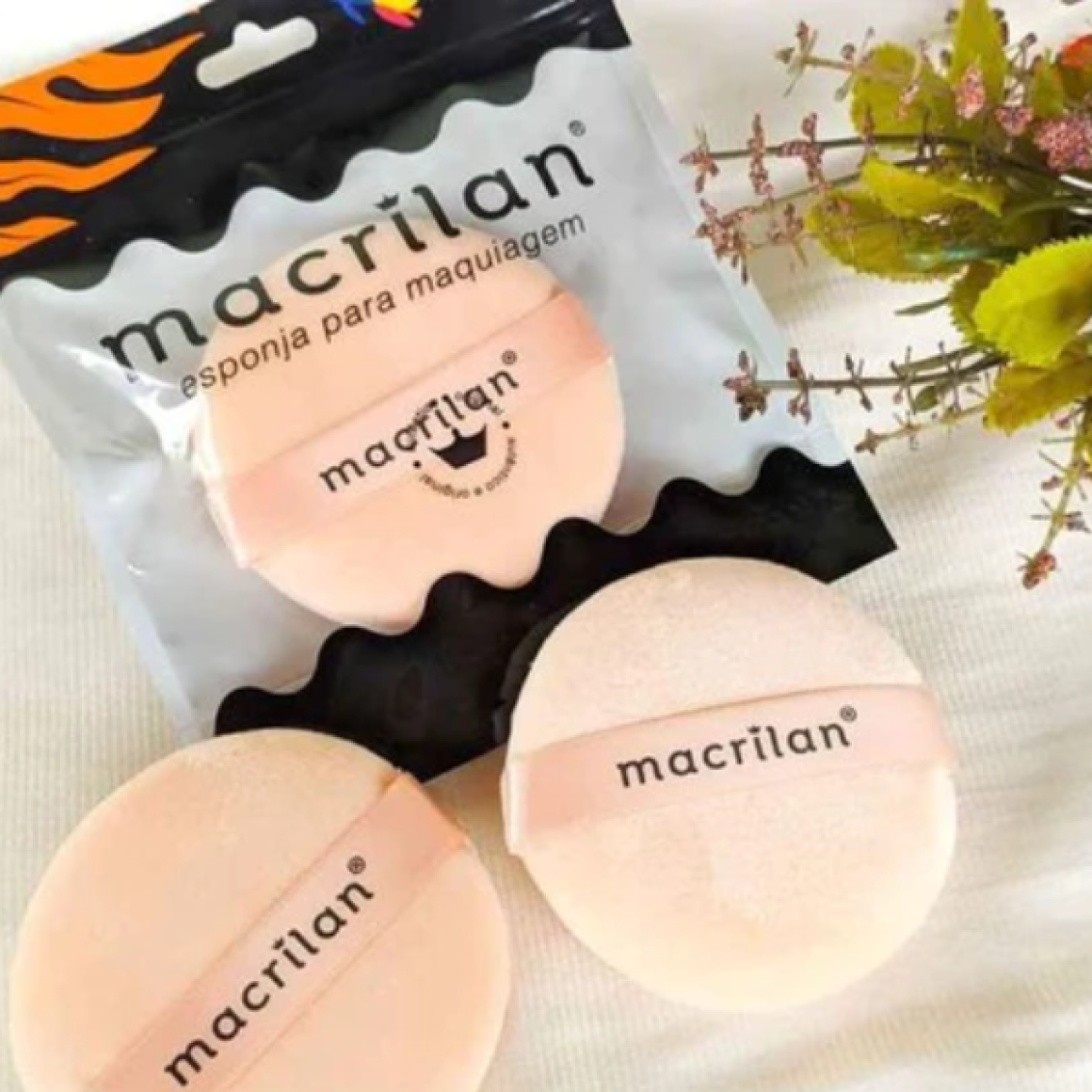 Esponja da Macrilan EJ1-14 especialmente desenvolvida para aplicação de pó facial, pó translúcido e iluminador. Vem com fita de cetim para apoio das mãos.