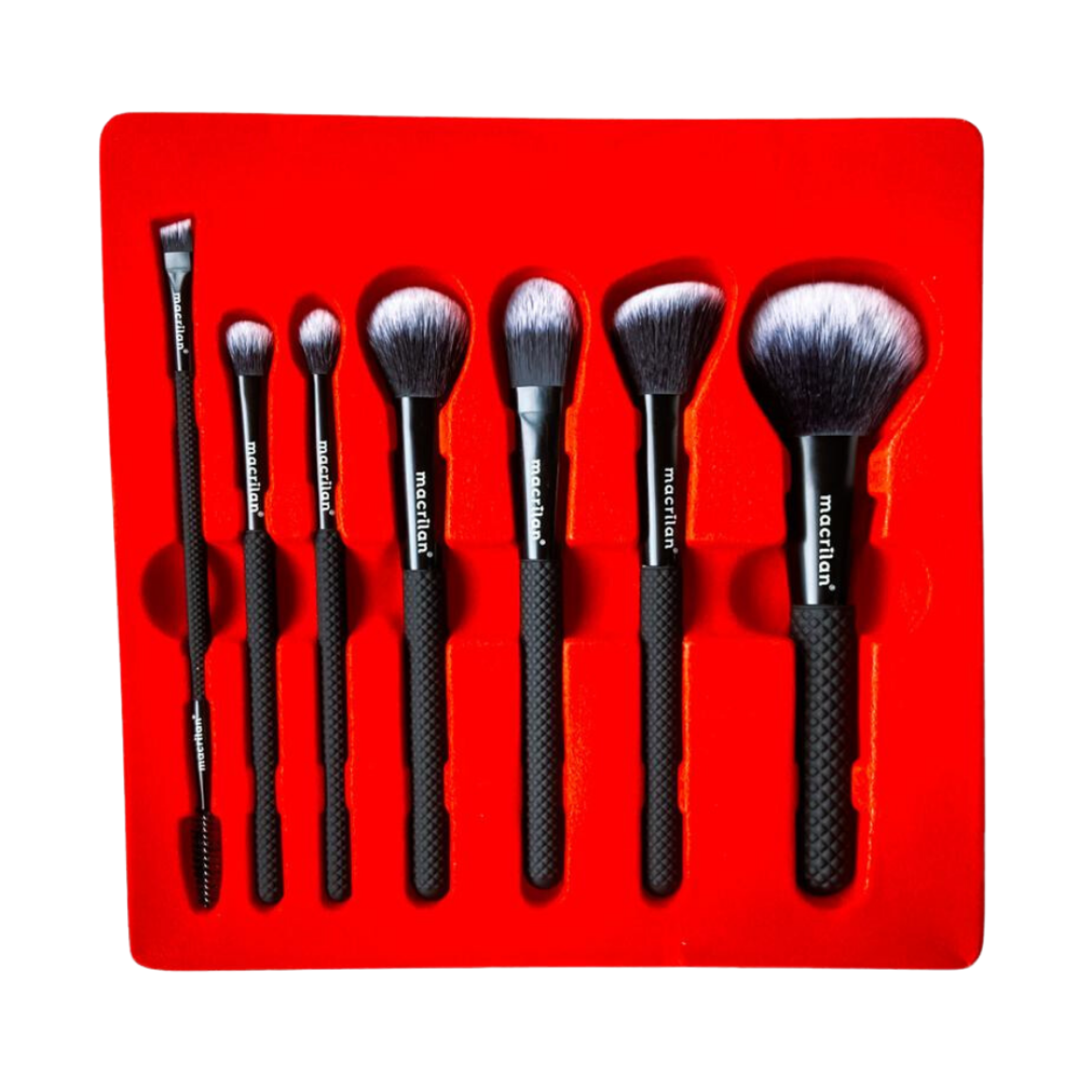 Kit Noir ED009 da Macrilan, feito com 7 pincéis profissionais para aplicação completa da maquiagem, tanto com produtos líquidos ou cremosos, como produtos em pó. Pincéis com cerdas super macias e em formatos especiais para um acabamento suave e impecável.