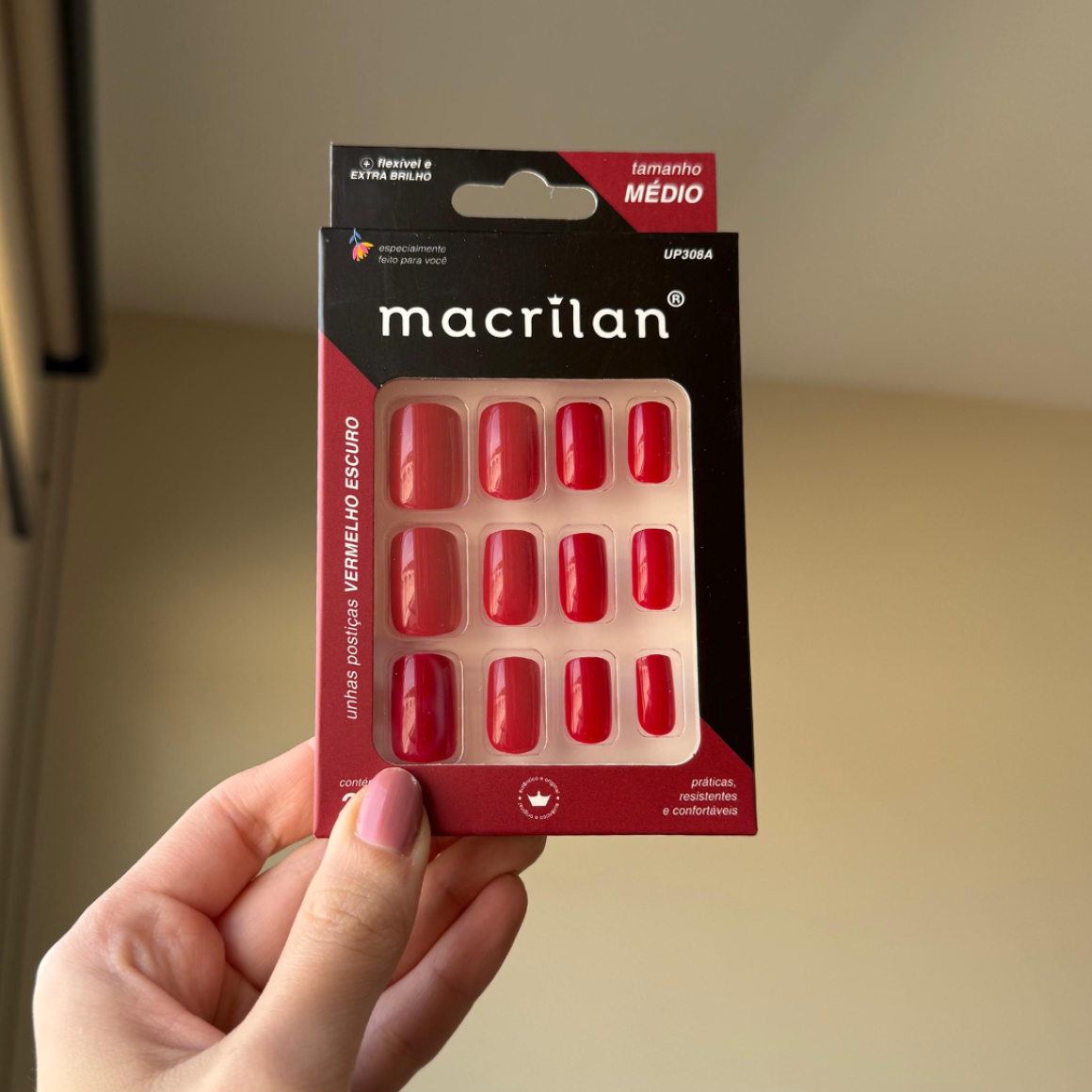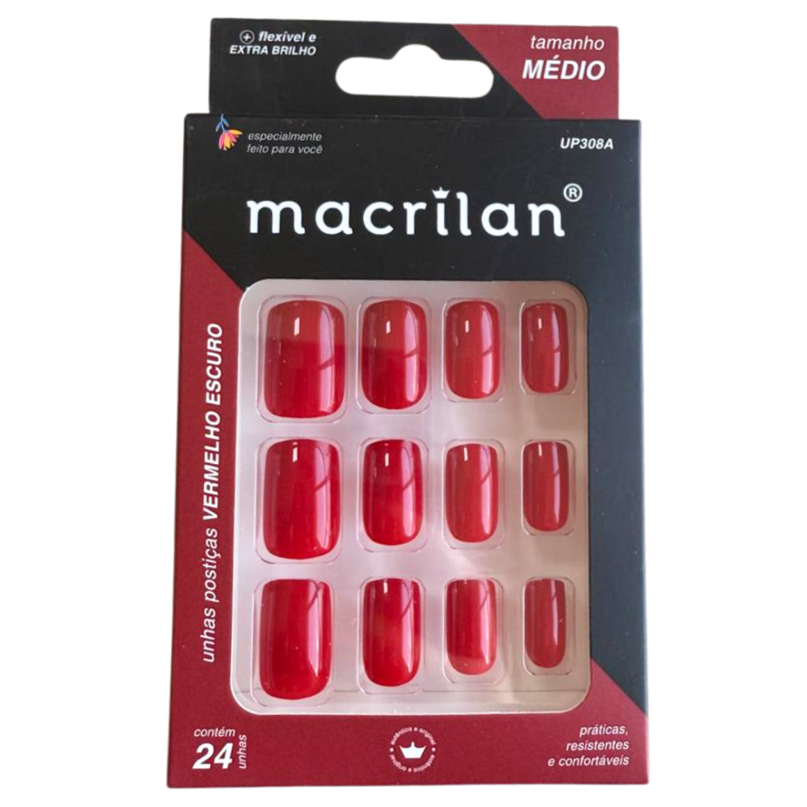 Unhas postiças UP308A tamanho médio Macrilan Vermelho Escuro, especialmente desenvolvidas em uma versão colorida para uma aplicação rápida e segura. Indicadas para uso pessoal e profissional.